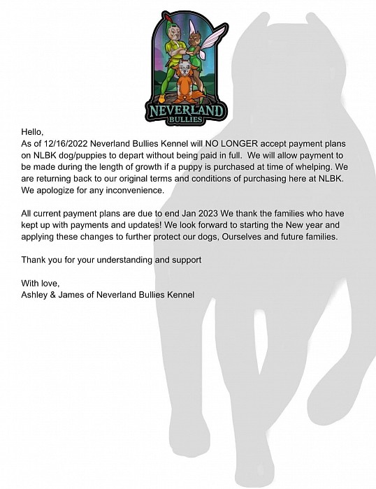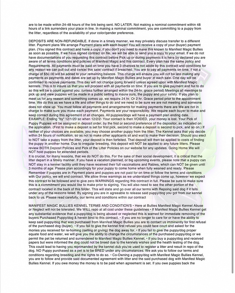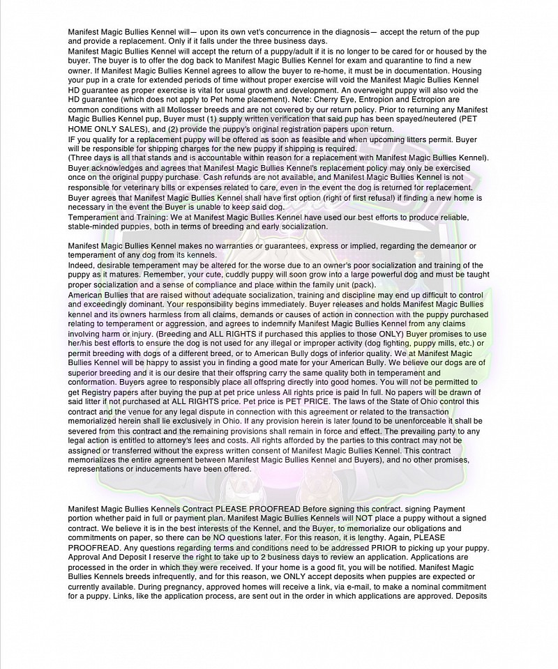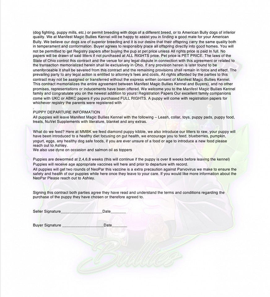 We will not Tolerate any Abuse. If it is brought to us and there is substantial evidence of abuse we will come directly to you. abuse can be an immediate repo of the dog?puppy that was purchased through MMBK (Manifest Magic Bullies Kennel).