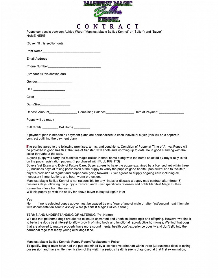 Manifest Magic Bullies Kennel incurs considerable expense and risk when a puppy leaves our Kennel. It is our hope that you make every effort to make it work out and accept that your new family member is a baby needing extra care. While we do not loan out puppies, we understand that sometimes customers decide they have made a mistake in purchasing a puppy.